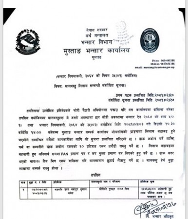 भन्सारले चौरीको पुच्छरको लिलाम गर्न असार ३ गतेको मिति तोकेको र लिलाम बिक्री भन्सारको जोमसोम कार्यालयबाट हुने नायब सुब्बा बिष्टले उल्लेख गरे ।
