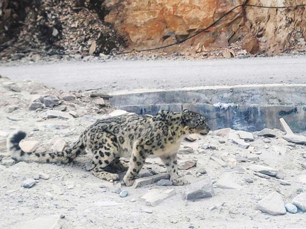 फोटो क्याप्सन : जोमसोम—कोरला सडकको समर खोलामा भेटियो दुर्लभ हिमचितुवा । तस्विर : छ्युमी बिष्ट ।