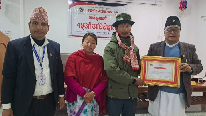 घरपझोङ—५ ठिनीका स्थानीय युवा निरज थकालीले गाउँपालिकाको लोगो तयार गरेको भन्दै उनलाई नगद २० हजार रुपैया नगद पुरस्कारसहित प्रशंसापत्रद्वारा सम्मान गरिएको हो । थकालीले गाउँपालिकाको विशेषताहरु भल्किने गरी केही महिना अघि लोगो तयार पारेका थिए ।