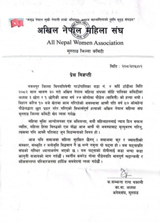 अनेमसंघ मुस्ताङकी कार्यवाहक अध्यक्ष सम्झना रानाद्वारा जारी प्रेस विज्ञप्तिमा अनेमसंघ नवलपुर विनयत्रिवेणी गाउँपालिका—४ स्थित पालिका कमिटी अध्यक्ष सावित्रीको गत ३० साउनमा आफ्नै पति महेन्द्र पौडेलद्वारा छुरा प्रहार गरी विभत्स हत्या गरिएको र उक्त घटनाको घोर भत्र्सना गर्दै प्रेस विज्ञप्ति जारी गरिएको अनेमसंघकी मुस्ताङ ईञ्चार्ज शर्मिला गुरुङले जानकारी दिनुभयो ।