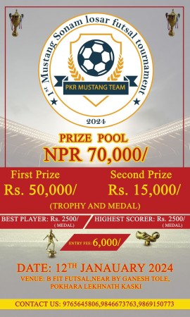सोनाम ल्होसार पर्वको अवसरमा मुस्ताङबाट हिउँदयामको जाडो छल्न बेसी झरेका मुस्ताङ युवा खेलाडी तथा मुस्ताङसंग प्रत्यक्ष जोडिएका पोखरामा संञ्चालित संस्थाहरुलाई समेट्ने गरी जनवरी १२ तारिखका दिन हिल इन पोखरा लेखनाथमा फुटसल प्रतियोगिता आयोजक गर्ने तयारी गरिएको आयोजक प्रतिनिधि जम्याङ ध्याचो गुरुङले जानकारी दिए ।