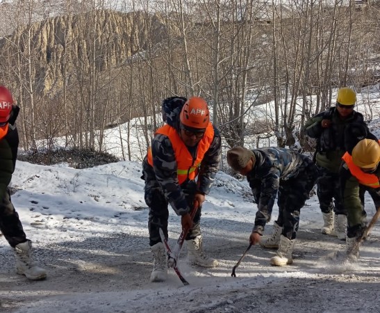 मुक्तिनाथ सडक माथि जमेको हिउँ सशस्त्र प्रहरीले पन्छ्यायो