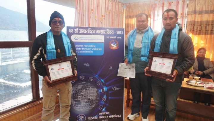 भन्सार दिवसका अवसरमा यहाँको मुस्ताङ भन्सार कार्यालयमा कार्यरत कम्प्युटर अपरेटर ओमप्रकाश महतोलाई प्रमाणपत्र विभागले प्रमाणपत्रद्वारा सम्मान गरेको छ । नेपाल—चिन सीमानाको कठिन भूगोलमा रहेर भन्सार प्रशासनको कार्यसम्पादन,लगनशील र कर्तव्यनिष्ट भएर सेवाग्राहीमैत्री कार्य उल्लेख गर्दै भन्सार विभागले सम्मान अर्पण गरेको हो ।